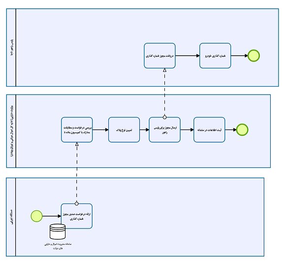 صدور مجوز شماره گذاری خودروخریداری شده دولتی به شرح ذیل انجام میشود: ۱- درخواست صدور مجوز شماره گذاری خودروخریداری شده دولتی در اداره کل اموال دولتی و اوراق بهادار بررسی شده و در صورت نیاز به مدارک تکمیلی یا عدم مطابقت با مجوز کمیسیون ماده ۲ و سایر قوانین و مقررات مربوطه، بازخورد مربوطه جهت اصلاح و تکمیل مدارک برای دستگاه متقاضی ارسال میشود، در این صورت پس از اصلاح و تکمیل مدارک مراحل بعدی خدمت انجام خواهد شد. ۲- پس از تایید مستندات و مدارک، نوع خودرو مبتنی بر آیین نامه چگونگی استفاده از خودروهای دولتی (اعم از دولتی، شخصی، عمومی و یا تشریفات) تعیین میگردد. ۳- مجوز شمارهگذاری خودرو به پلیس راهور ارائه شده و همچنین یک رونوشت از آن به دستگاه متقاضی جهت پیگیری تقاضا ارائه میشود. ۴- شمارهگذاری (اختصاص پلاک و VIN) در پلیس راهور و ارائه مستندات مربوطه به اداره کل اموال دولتی و اوراق بهادار. ۵- ثبت اطلاعات در سامانه جامع خودرو توسط اداره کل اموال و اوراق بهادار |