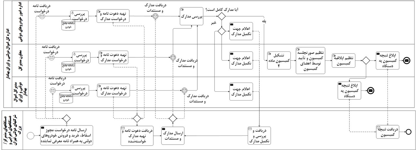 پس از دریافت درخواست دستگاههای دولتی جهت اخذ مجوز اسقاط، خرید و فروش خودروهای دولتی، با بررسی اولیه مدارک، کمیسیون ماده ۲ تشکیل شده و با تنظیم صورتجلسه، نتیجه به دستگاه متقاضی اعلام میشود. |
