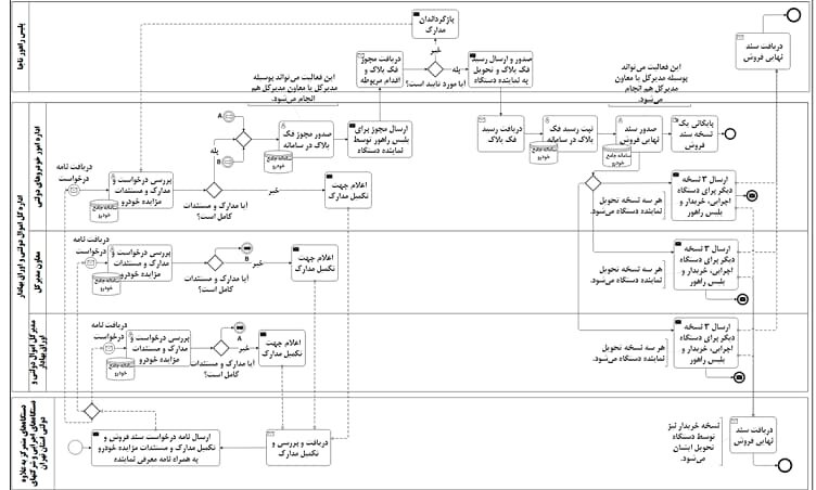 درخواست دستگاه اجرایی برای دریافت سند فروش خودرو به همراه مدارک و مستندات دریافت شده و پس از بررسی و در صورت کامل بودن مدارک، مجوز فک پلاک، توسط اداره امور خودروهای دولتی صادر میشود. پلیس راهور پس از دریافت مجوز فک پلاک، رسید فک پلاک را صادر میکند و در مرحله بعد اداره امور خودروهای دولتی با دریافت رسید فک پلاک و پیش نویس سند فروش را تهیه و نهایتاً سند نهایی فروش را صادر کرده و به دستگاه اجرایی تحویل میدهد. |