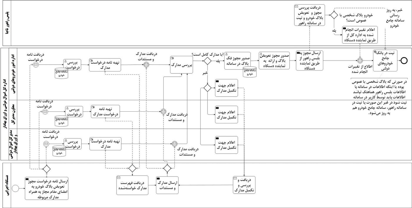 پس از دریافت نامه درخواست مجوز تعویض پلاک و مستندات مربوطه توسط اداره امور خودروهای دولتی و بررسی مدارک و مستندات، مجوز تعویض پلاک (در صورت کامل بودن مدارک) صادر شده و پس از تعویض، نتیجه در بانک جامع خودروهای دولتی (در صورت دولتی بودن خودرو) ثبت میشود. لازم به ذکر است که تعویض پلاک در خصوص مفقودی پلاک، جابجایی پلاک، اختصاص پلاک شخصی میباشد. |