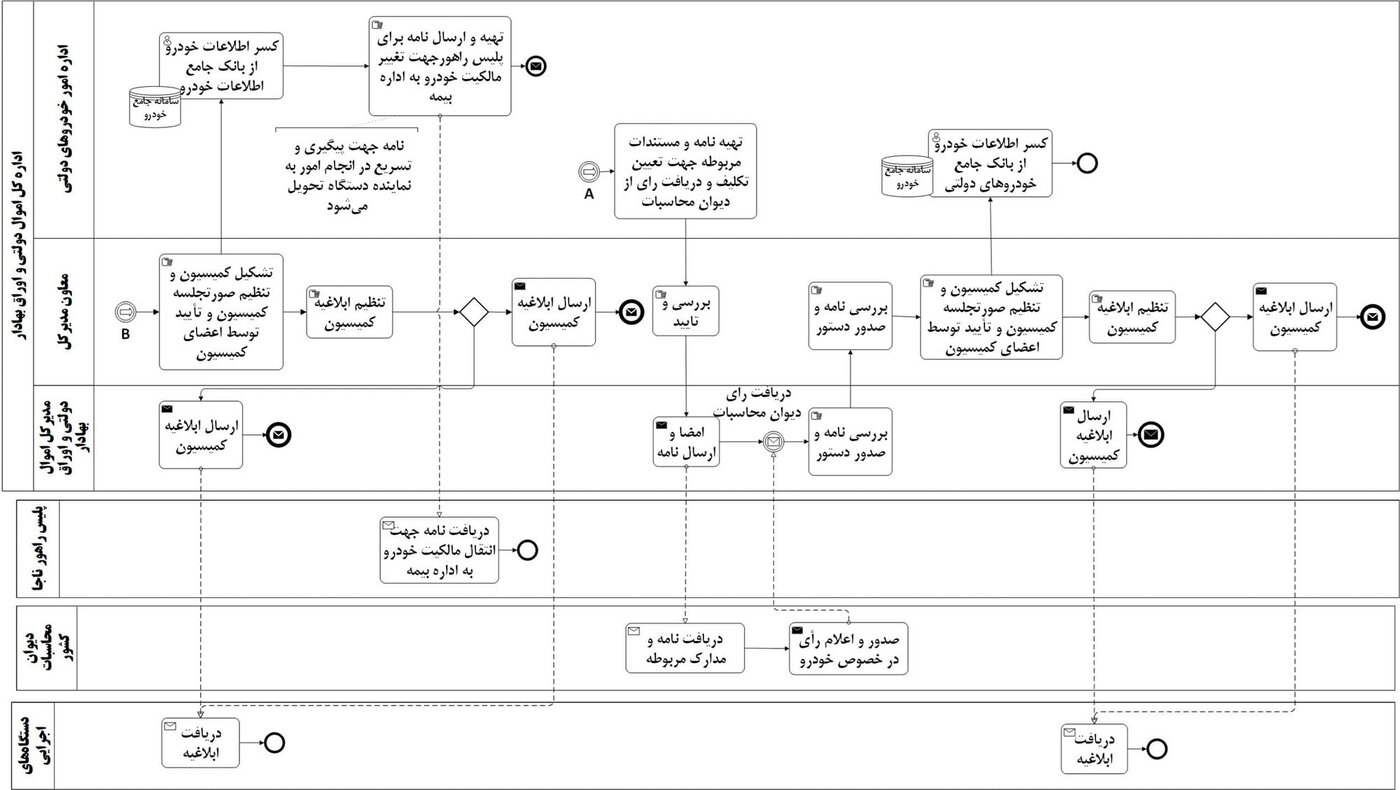 پس از دریافت نامه درخواست مجوز انتقال خودروهای خسارتی و سرقتی به بیمه با کسر از آمار کمیسیون توسط اداره امور خودروهای دولتی و بررسی مدارک و مستندات، کمیسیون ماده ۲ تشکیل شده و در صورت موافقت، اطلاعات خودرو از بانک جامع خودروهای دولتی حذف میشود. در صورت بیمه نبودن خودرو، برای تعیین تکلیف با دیوان محاسبات کشور مکاتبه شده و رای دیوان در کمیسیون ماده ۲ مورد استفاده قرار میگیرد. |