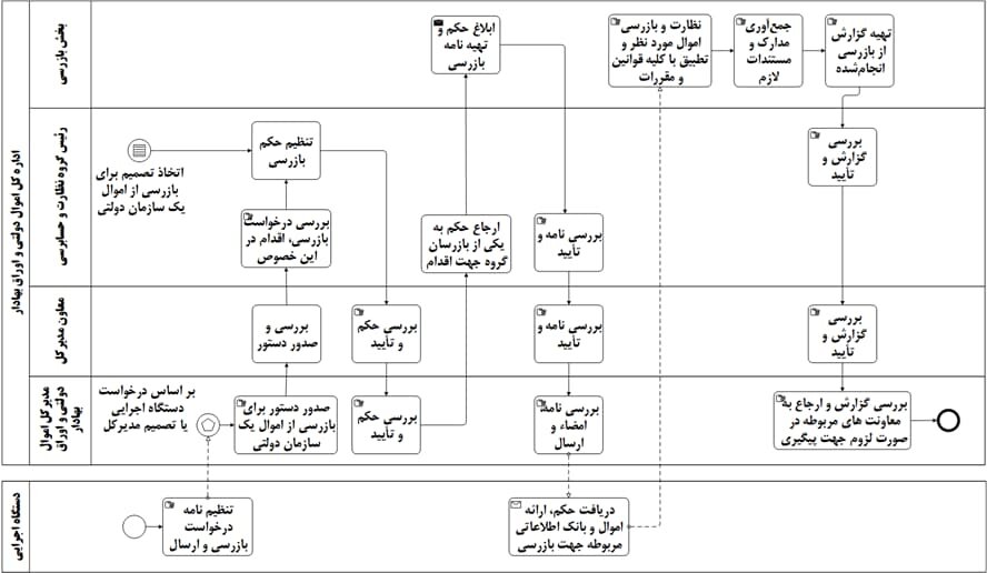 بر اساس درخواست دستگاه اجرایی یا تصمیم ریاست بخش نظارت و حسابرسی و یا دستور مدیرکل اموال دولتی و اوراق بهادار، انجام نظارت و بازرسی از اموال یک سازمان دولتی در دستور کار قرار میگیرد و بر اساس آن حکم بازرسی برای یکی از بازرسان گروه نظارت و بازرسی صادر شده و با همکاری دستگاه مربوط، فهرست اموال مورد نظر و انطباق آن با قوانین و مقررات مورد بازرسی قرار میگیرد. سپس با جمع آوری مدارک و مستندات لازم، گزارش بازرسی توسط بخش بازرسی تهیه و توسط رئیس گروه نظارت و بازرسی برای مدیر کل اموال دولتی و اوراق بهادار ارسال میشود. |